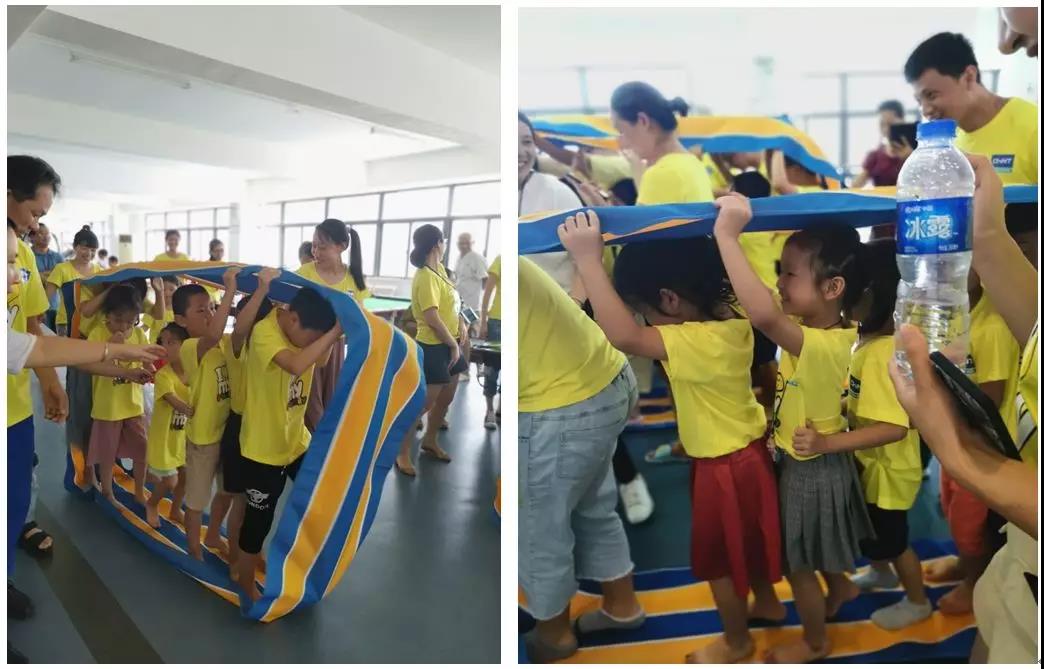 隨后,活動在一場歡快的“兔子舞”中拉開了序幕,本次活動設置了 “過河拆橋”、“無敵風火輪”、“投籃高手”等系列趣味小游戲。在活動中,家長和孩子們密切配合,整個現場處處洋溢著家長和孩子們的歡聲笑語,全員為孩子們加油喝彩,助威鼓勁,活動中最別具一格的游戲是“無敵風火輪”,由于擋住了前方視線,孩子要有基本的方向意識,游戲有一定的難度,在旁觀看的爸爸媽媽們即是激動又是緊張,在爸爸媽媽們的幫助和指導下孩子們順利完成游戲任務,最后家長們也積極興奮的PK挑戰(zhàn),體驗孩子們的樂趣、童真。